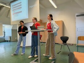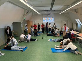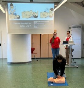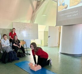 Nach dieser praktischen Erfahrung folgte der zweite Theorieblock, der sich dem Thema "Herz-Lungen-Wiederbelebung" widmete. Die Mitglieder der Sani-AG erklärten anschaulich die Grundlagen des Blutkreislaufs und die lebensbedrohlichen Folgen eines Herzstillstands. Einige Zahlen und Fakten machten deutlich, wie zeitkritisch es ist, wenn ein Herz plötzlich zu schlagen aufhört. Bis der Rettungswagen eingetroffen ist, sind Gehirnzellen möglicherweise schon irreparabel geschädigt, weshalb es unumgänglich ist, schnell selbst zu helfen. Würden sich mehr Menschen die Laienreanimation zutrauen, könnten in Deutschland pro Jahr über 10.000 zusätzliche Menschenleben gerettet werden! Anhand von Reanimationspuppen demonstrierten die Schülerinnen aus EF und Jahrgang 10 der Sani-AG als Nächstes die korrekte Druckpunktlage auf dem Brustkorb und die richtige Frequenz der Herzdruckmassage. Auch die korrekte Mund-zu-Mund-Beatmung wurde thematisiert, wobei auch Möglichkeiten des Eigenschutzes durch Hygienetücher angesprochen wurden.