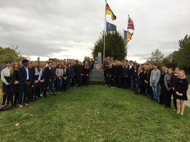 In der Woche vor den Herbstferien [2019] fuhr ein Teil des Schulorchesters nach Ypern, Belgien, um an offiziellen Feierlichkeiten im Rahmen des Dig Hill 80 Projekts teilzunehmen. Gemeinsam mit Frau Brill und Frau Löbke machten wir uns also per Bus auf den Weg. Das Dig Hill 80 Project Whitesheet 2018, bzw. Höhe 80 Project Whitesheet 2018, ist ein Ausgrabungsprojekt in Flandern, Belgien. Im Ersten Weltkrieg diente der Ort Wytschaete (engl. „Whitesheet“) deutschen Truppen als Militärstützpunkt, den sie umfangreich ausbauten. Am Ortsrand lag die strategisch bedeutende Stellung „Höhe 80“ mit Schützen- und Laufgräben, Kommandozentrale, unterirdischen Kasernen, Beobachtungsposten und Tunnelverbindungen zur Frontlinie. Hier kam es im Rahmen der Flandernschlachten 1914-1918 zu einem vierjährigen Grabenkrieg zwischen deutschen Truppen einerseits und Alliierten anderseits. Am Ende des Krieges war der Ort Wytschaete nahezu vollständig zerstört. Die zahlreichen Granattrichter und militärischen Gräben um die Höhe 80 wurden mit Erde angefüllt. Im Jahr 2015 sollte auf diesem bisher ungenutzten Gebiet ein Wohngebiet entstehen. Dazu wurden Testgrabungen durchgeführt, bei denen Kriegshinterlassenschaften gefunden wurden. Daher folgte 2018 eine großflächige Ausgrabung auf einem 1,1 Hektar großen Areal, an der Archäologen, Historiker und freiwillige Grabungshelfer aus mehreren Ländern beteiligt waren. Finanziert wurden diese aufwendigen Grabungen durch Crowdfunding. Dabei wurden auch die sterblichen Überreste von etwa 130 gefallenen Soldaten gefunden, die zum Teil in Massengräbern verscharrt worden waren. Es wurde versucht, sie zu identifizieren, um sie dann auf einer der umliegenden Kriegsgräberstätten würdig zu bestatten. Schüler unserer Partnerschule St.Joseph's College in Ipswich, sowie Schüler einer irischen Schule wurden 2018 Zeugen dieser Ausgrabungen. So wurden wir zusammen mit diesen Schülern aus England eingeladen, an der Zeremonie der feierlichen Beisetzung im Oktober 2019 teilzunehmen und diese als Orchester musikalisch zu begleiten. Für rund 30 Schülerinnen und Schüler des Schulorchesters fuhr der Bus am 7.10.2019 nach Belgien. Nach einer etwa siebenstündigen Fahrt kamen wir gegen 15 Uhr in der Jugendherberge Peace Village in dem kleinen Ort Mesen an. Abends gab es gleich das erste Highlight, und zwar das „Last Post“ am Menin Gate in der Stadt Ypern. Das Menin Gate ist ein großes Denkmal in Form eines Ehrenbogens zum Gedenken an die um Ypern gefallenen Soldaten Großbritanniens und des Commonwealth, die nicht identifiziert und ohne eigenes Grab sind. Bei diesem Denkmal findet seit 1928 jeden Abend um 20.00 Uhr eine Gedenkzeremonie statt, das „Last Post“. Sechs Schüler von uns durften dort zwei Kränze ablegen, um den gefallenen Soldaten zu gedenken. Am nächsten Tag ging es für uns zunächst mit intensiven Orchesterproben weiter. Nachmittags hatten wir Gelegenheit, das „In Flanders Fields Museum“ in Ypern zu besuchen. Dieses ist ein Kriegsmuseum mit einer Dauerausstellung zum Thema „Erster Weltkrieg in Belgien“. Am Abend wurde uns das „Dig Hill 80 Project“ im Rahmen eines Vortrages vorgestellt. Unter anderem war auch Simon Verdegem anwesend, leitender Archäologe und Initiator des Projekts. Nach dem Frühstück am Mittwoch wurden wir von einem belgischen Lehrer durch die alten Schützengräben der German Battlefield Sites geführt. Donnerstag war ein aufregender und kalter Tag. Vormittags hatten wir unseren ersten gemeinsamen Auftritt mit den englischen Schülern im Rahmen der britischen Beerdigung, die sehr feierlich und auch interessant verlief, allerdings für uns auch etwas befremdlich, da es eine sehr strukturierte und militärische Zeremonie war. Es war eine ausgesprochen bewegende Erfahrung, für die wir sehr dankbar sind. Mit gefrorenen Fingern kehrten wir in die Jugendherberge zurück. Abends aßen wir dann mit den Schülern aus Ipswich, die an diesem Tag angekommen waren, in einem Restaurant in Ypern. Am folgenden Tag, Freitag, nahmen wir an der deutschen Beerdigung teil. Auch das war eine sehr wertvolle Erfahrung, da sehr viele Menschen kamen, sogar eine Grundschulklasse aus Hövelhof. Am Abend fand mit den Briten das gemeinsame Abschlusskonzert „In Memoriam“ in der großen Wijtschate Church statt. Dieses war auch unser persönliches Highlight, da eine sehr schöne und andächtige Stimmung herrschte und es ein tolles Gefühl war, mit den englischen Schülern gemeinsam zu musizieren. Es war ein sehr gelungener Auftritt. Nach dem Konzert hatten wir noch Gelegenheit, mit den Engländern im Peace Village Zeit zu verbringen und etwas zu feiern. Es wurde ein sehr schöner Abschussabend.