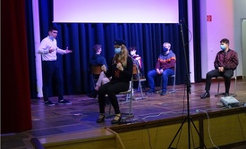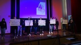Der Literaturkurs der Q1 stellte in Form einer fiktiven Busfahrt die Leitfrage der Veranstaltung: „Wo fängt Rassismus eigentlich an?“. Die literarische Szene zeigte uns, dass kein aktives Handeln gegen Rassismus oder kein Einschreiten in Situationen, in welchen wir Diskriminierung mitbekommen, einer Zustimmung gleicht. Fast alle Fahrgäste der fiktiven Busfahrt hatten Vorurteile, auch wenn manche nur verdeckt zum Vorschein kamen. Deutlich wurde, dass Rassismus im Inneren zu keimen beginnt. Wer sich nicht aktiv gegen Rassismus einsetzt, ist Teil des Problems.