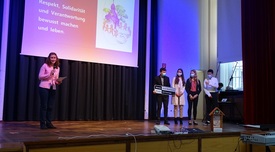 Frau Peppmöller lobte anschließend bei der Übergabe der Urkunde die bisher geleistete Arbeit. Sie könne z. B. an dem erstellten Wertekonzept die Sichtweise der Schule erkennen und freue sich sehr, das Theodorianum auf dem weiteren Weg begleiten und unterstützen zu dürfen.