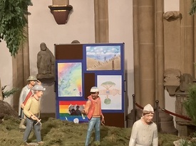 An der Krippe im Paderborner Dom sind ab sofort Bilder zum Wettbewerb „Friedensplakat – Mit Mitgefühl führen“ ( wir berichteten) zu sehen.