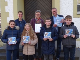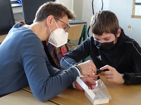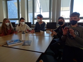 Dr. Jochen Viehoff als Geschäftsführer des HNF und Irmgard Rothkirch als Verantwortliche für die Kooperationschulen besuchten das THEO und brachten auch ein paar Microbits mit, die sofort Begeisterung bei Mariella, Felicitas, Max und Maximilian aus dem Jahrgang 6 hervorriefen.