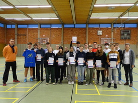 Bevor es zu den entscheidenden Spielen ging, fand in der kurzen Pause nach den Halbfinals noch die offizielle Ehrung der neu ausgebildeten Sporthelfer durch Schulleiterin Nicole Michaelis und Sportlehrer Dain Czeszak statt.