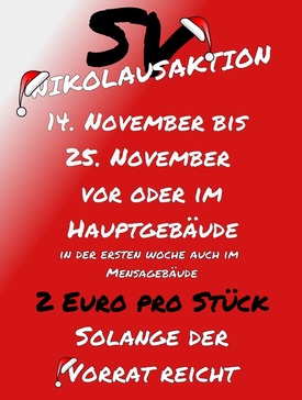 Auch dieses Jahr steht wieder die Nikolaus-Aktion vor der Tür. Vom 14. bis zum 25. November könnt ihr vor oder im Hauptgebäude (und in der erste Woche auch im Mensagebäude) Nikoläuse für eure Freunde kaufen und ihnen damit eine Freude machen. Denn die bestellten Überraschungen werden am 6. Dezember, dem Nikolaustag, von der SV in den Klassen verteilt. Also überlegt euch schon mal, wen ihr diesen Advent gerne beschenken würdet und wir helfen euch mit unserer Aktion dabei!