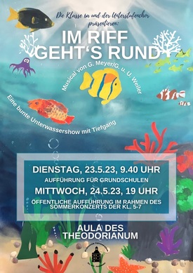 Nach aufwändigen und spannenden Vorbereitungen (vom Proben über das eigene Gestalten des Bühnenbilds) ist es nun endlich so weit. Das Musical "Im Riff geht's rund" erlebt am Dienstag, den 23.5.23, seine Uraufführung. Zunächst für ausgewählte Grundschulklassen, wird das Musical zudem am Mittwoch, den 24.5., im Rahmen des Sommerkonzerts der Klassen 5-7 aufgeführt.
