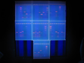 Und wenn wir die Tiere nicht in die Biologiesammlung holen können, weil sie ausgestorben uder einfach zu groß oder auch gefährlich sind, dann fahren wir eben hin, z. B. in den Zoo, so wie hier eine Klasse der Jahrgangsstufe 5. Der Ökologiekurs geht dann schon einmal "baden", um auch an schwierigen Orten Angepasstheiten der Organismen der Fließgewässer zu untersuchen. Und der Genetikkurs untersucht im Gentechniklabor Teutolab der Universität Bielefeld, einem unserer Kooperationspartner, mit dem Verfahren der "Tierartdifferenzierung", ob denn der als "Wildlachs" gekennzeichnete Fisch nicht doch aus aus einer Lachszucht stammt. Der bildhafte Nachweis mit Hilfe der Elektrophorese liefert dann das Ergebnis - wenn exakt gearbeitet wurde!