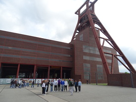 Um 10:30 Uhr besuchten wir die Zeche Zollverein in Essen. Dort erhielten wir eine Einführung in die Geschichte des Standorts und erfuhren, wie er heute genutzt wird. Früher wurde im Süden des Ruhrgebiets Kohle abgebaut und über die Ruhr für den Export transportiert. Die Fettkohle wurde zu reiner Kohle verarbeitet und über die Eisenbahnlinie Rhein-Weser transportiert. Das Wahrzeichen des Geländes ist der Ehrenhof.