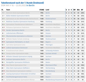In den letzten beiden Runden am Samstag und Sonntag zeigten alle Spieler jedoch nochmal beste Moral und erreichten am Ende nach zwei verdienten 4:2-Siegen noch den fünften Rang (sogar vor dem Pelizaeus Gymnasium). Platz 3-5 waren punktgleich mit Platz zwei, nur getrennt durch die Feinwertungen.